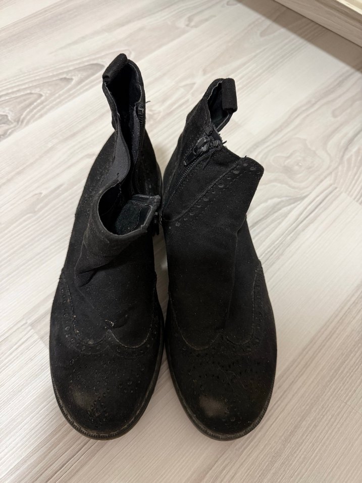 Siyah süet, gizli topuklu, tokalı ve gotik tarzda kadın botlarıdır. Desensiz ve koyu renkte, günlük kullanıma uygundur.