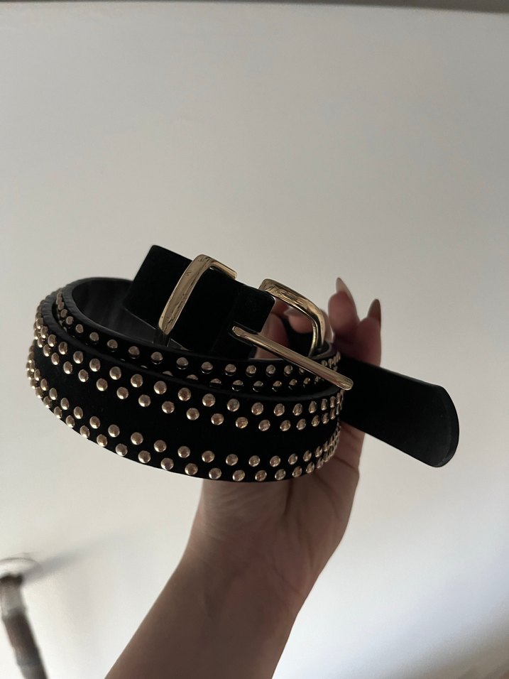 Siyah süet kemer, metal perçinlerle süslenmiş ve bel detaylıdır. Parisli rock punk tarzını yansıtır.