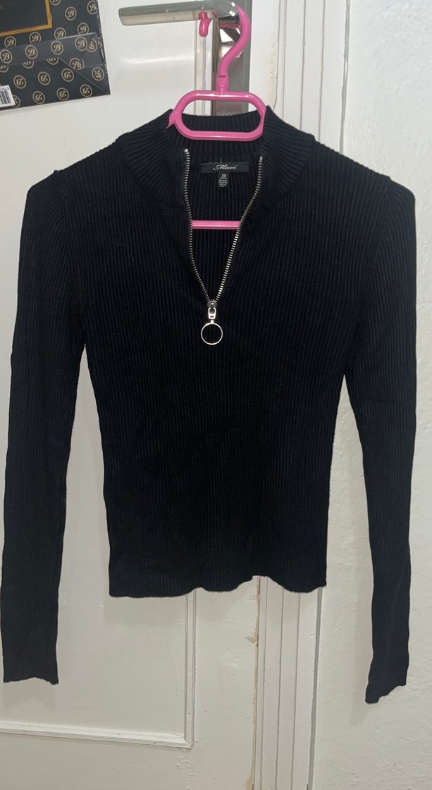 Siyah, süet görünümlü yumuşak triko kumaştan yapılmış, yarım fermuarlı ve yüksek yakalı, vücuda oturan uzun kollu bir kazak. Günlük kullanım için uygundur. esnektir, xs-s gibi düşünebilirsiniz, deforme yoktur.
