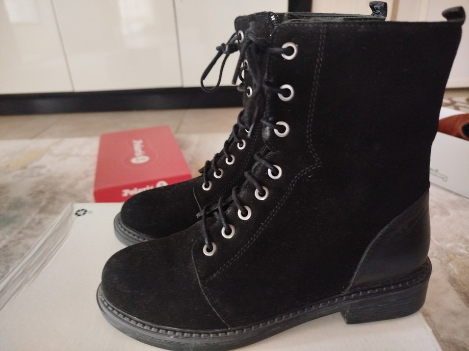 Siyah süet malzemeden yapılmış, blok topuklu ve tokalı, gotik tarzda kadın botu. Rock punk havası taşıyan günlük kullanıma uygun bir model.