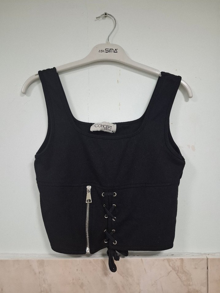 Siyah süet kumaştan, straplez yaka ve fermuar ile bağcık detaylı, gotik tarzda sıkı oturan mini bustiyer. Trendy günlük kullanım için sorunsuzdur