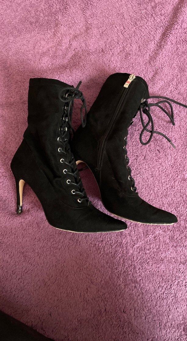 Siyah süet gotik botlar, stiletto topuklu tasarıma sahip. Yan fermuarlı ve desenli yapısıyla cesur romantik akşamlar için uygun.