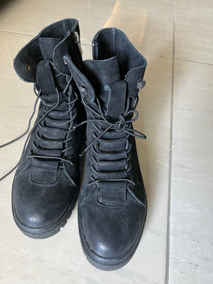 Siyah süet gotik stiletto topuklu, bağcıklı ve tokalı botlar, günlük kullanıma uygun.