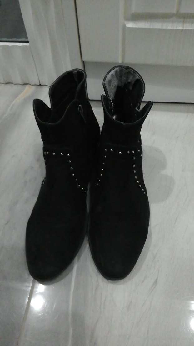 Siyah süet kadın botlar, stiletto topuklu ve tokalı detaylara sahip. Gotik tarzda, koyu renkte ve desensiz tasarlanmıştır. Botun 1 tanesinin içinde soyulma var giymeye engel değil bilerek alın lütfen