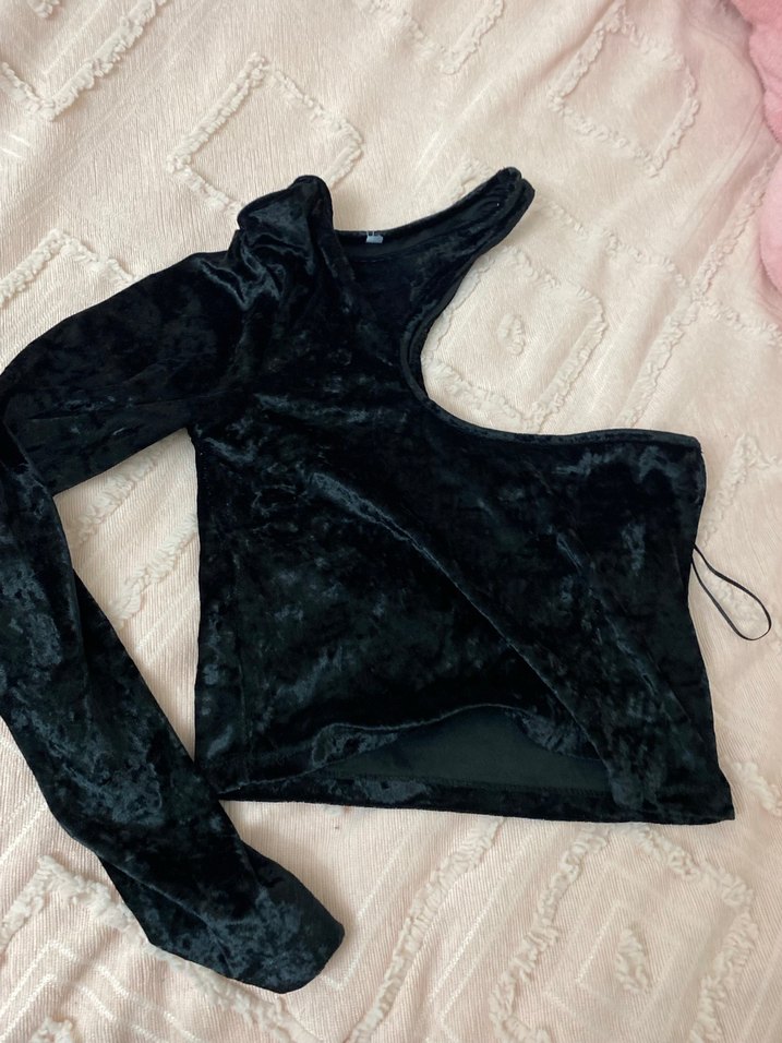 Siyah süet kumaştan, yüksek yakalı ve uzun kollu, drapeli, gotik tarzda, normal boyda, vücuda oturan bir bluz. Romantik akşamlar için uygun.