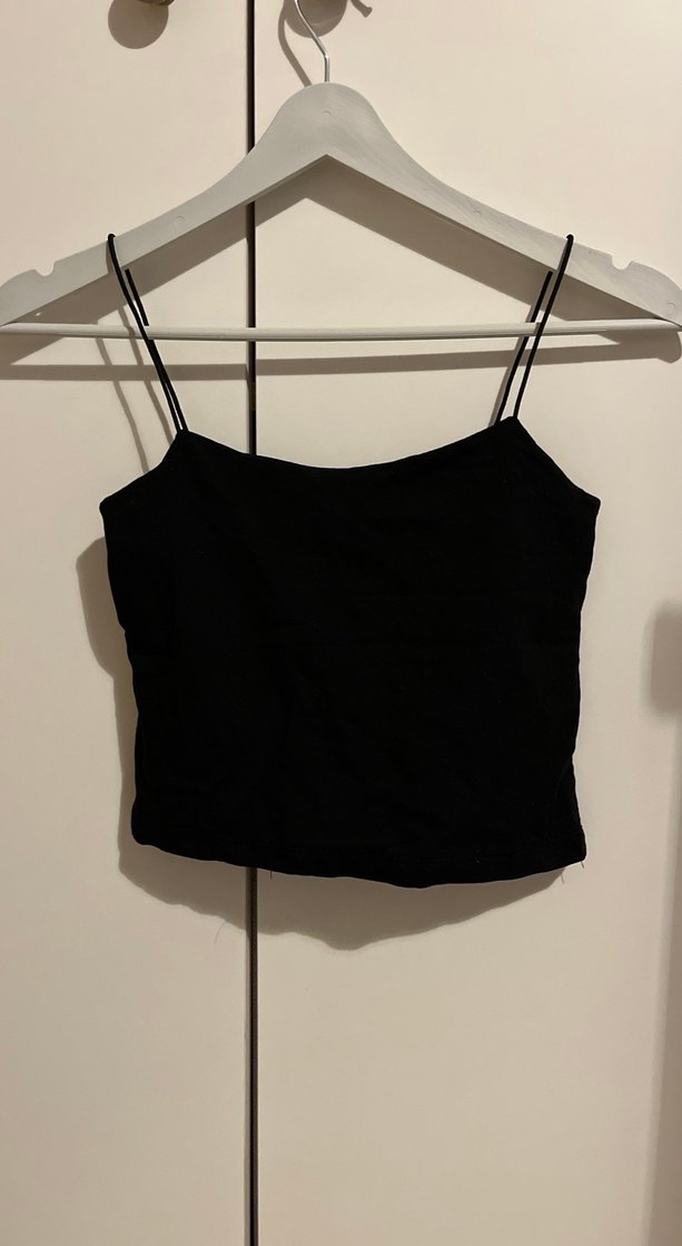 Düz siyah süet kumaştan, ince askılı ve düz yakalı, günlük kullanıma uygun minimal ve şık kadın atlet.