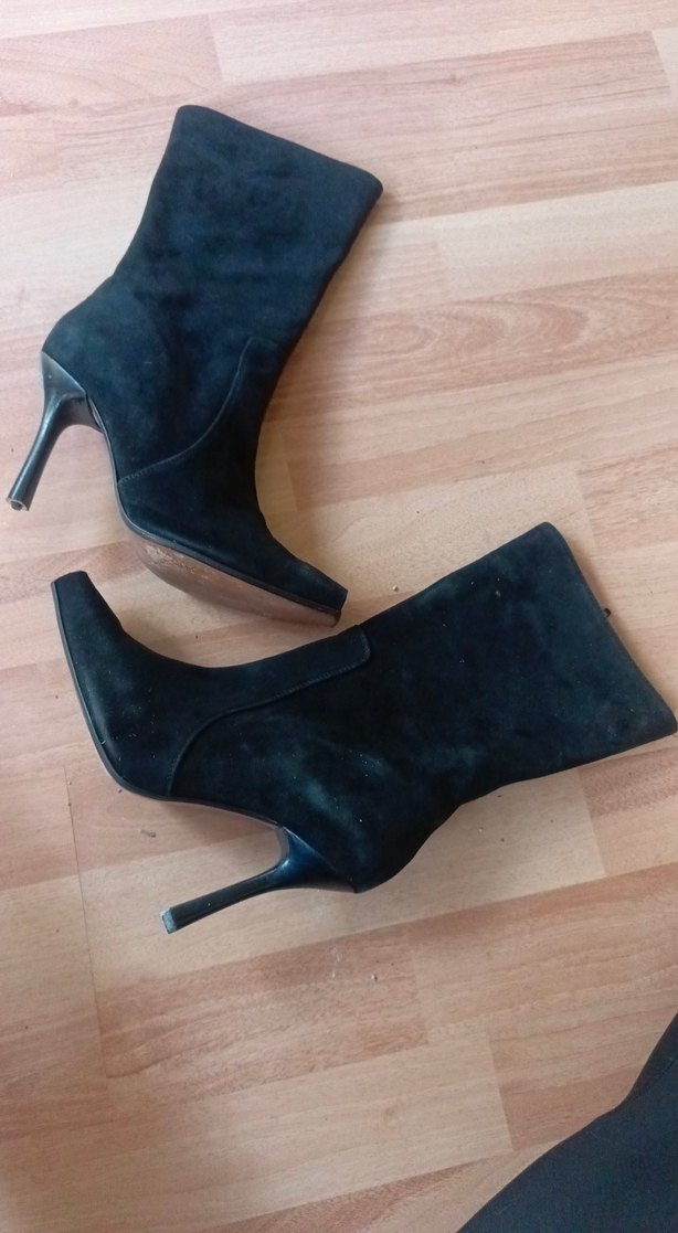 Siyah süet kadın botu, ince topuklu, içi deri dışı süet, topuk 9 punto. Minimalist gotik tarzı ve romantik akşamlar için uygundur.