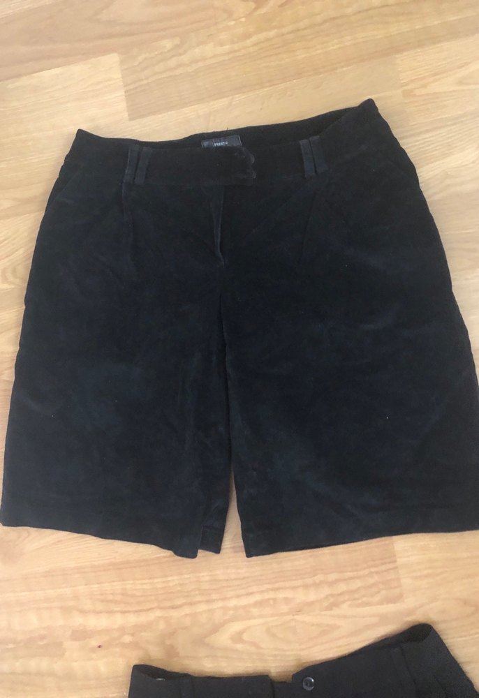 Siyah süet malzemeden yapılmış, bol kesimli kısa kadın bermuda şort, ofis ve günlük sokak tarzına uygundur.