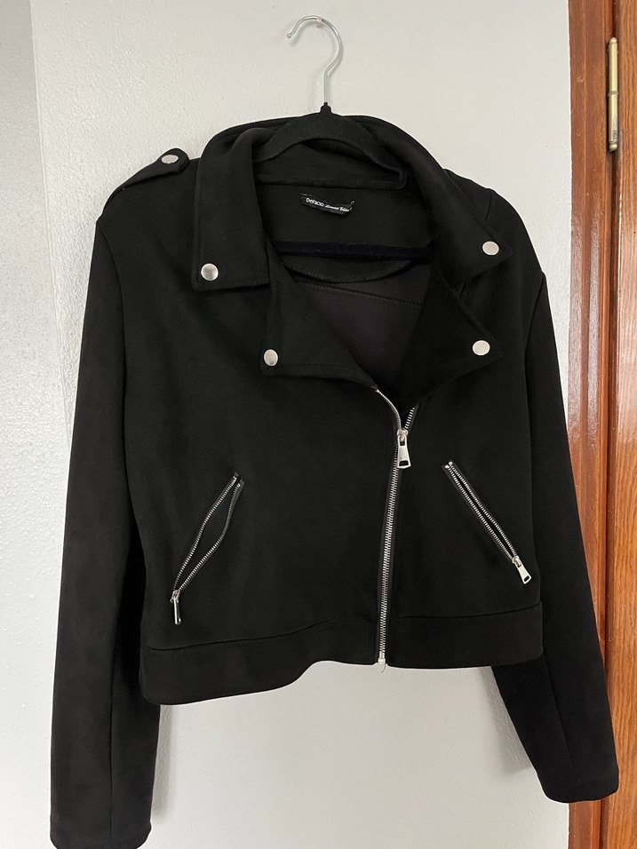 Siyah süetten yapılmış, çıtçıtlı yakalı ve fermuarlı cepleri olan biker ceket. İnce kesim, normal boy ve strappy kollu, minimalist tarz için uygundur.