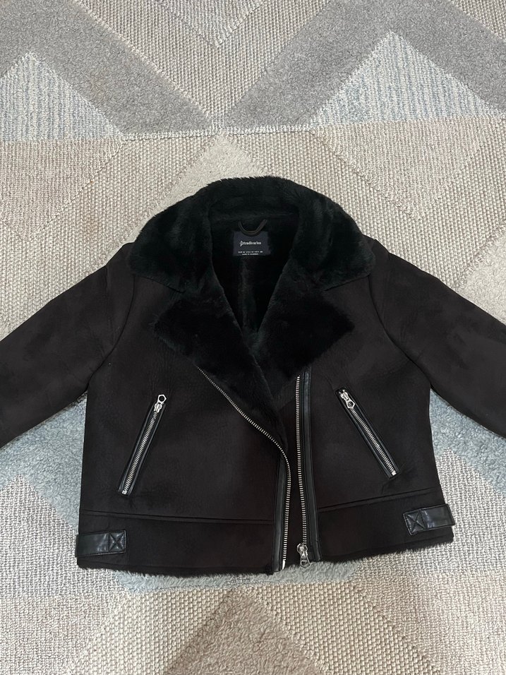 Siyah süet biker ceket, kürklü yakası ve dar kesimiyle dikkat çeker. Uzun kollu, fermuarlı ceplidir ve midi normal boydadır. Rahat ve şık bir görünüm sağlar. 1-2 kere giyildi yeniden farkı yok