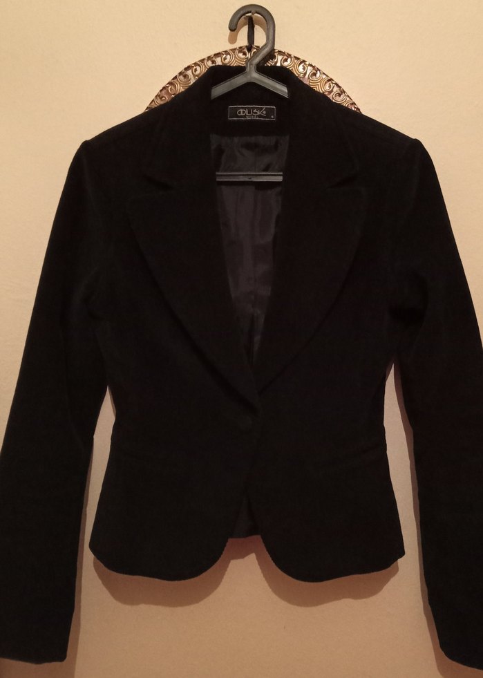 Siyah süet kumaştan yapılmış, uzun kollu, düğmeli, klasik kesim midi uzunlukta kadın blazer ceket. Ofis şıklığı için uygundur.