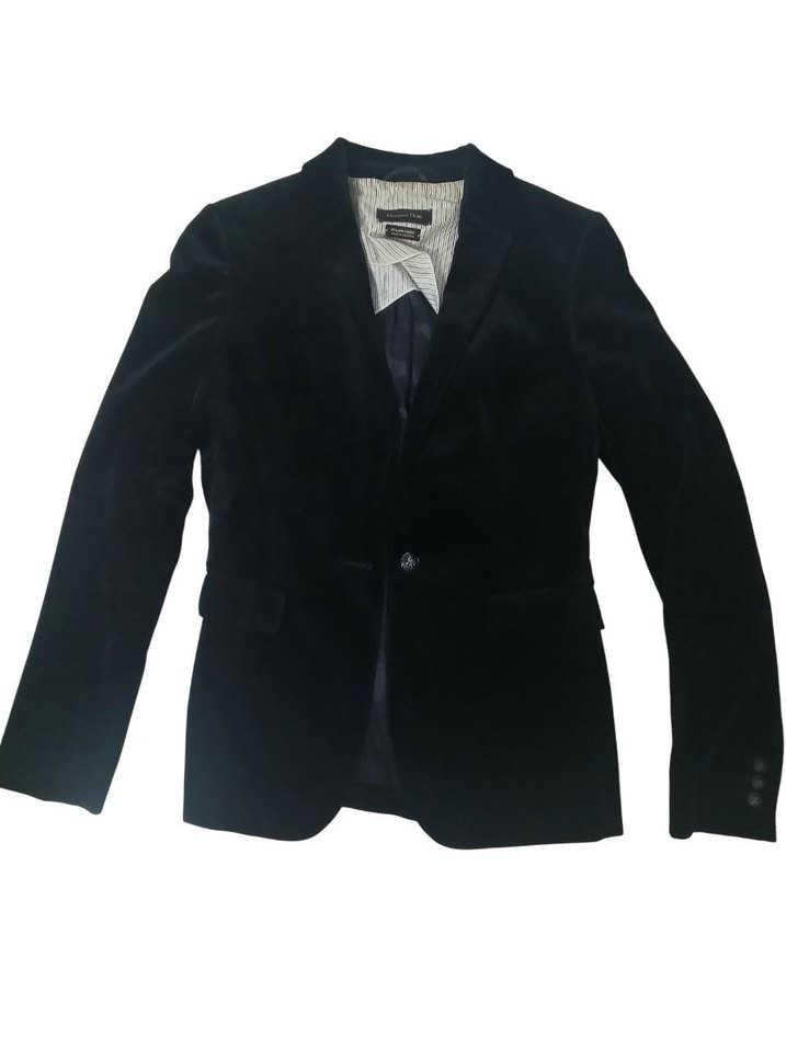 Siyah süet kumaştan, düğmeli, normal kesim ve midi boyda kadın blazer ceket. Uzun kollu ve ofis kullanımına uygun şık model.
