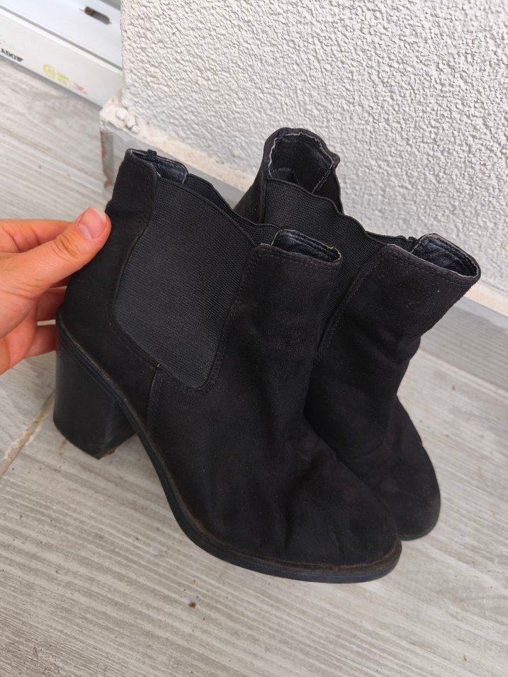 Siyah süet kadın bot, kalın topuklu ve günlük kullanıma uygun rahat gotik tarzda.