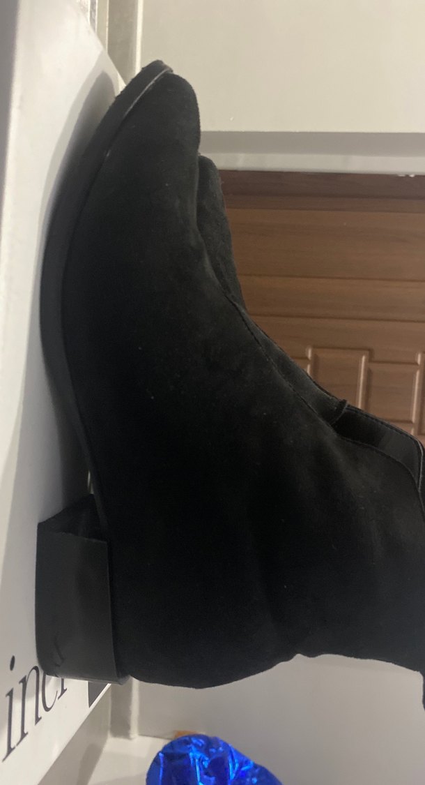 Siyah süet kadın bot, blok topuklu ve günlük kullanıma uygun. 38 numara dar kalıp. İçi yün sıcak tutar. Sivri burun şık ayakkabı. Markasını unuttum(hotiç,elle ya da inci olması lazım)