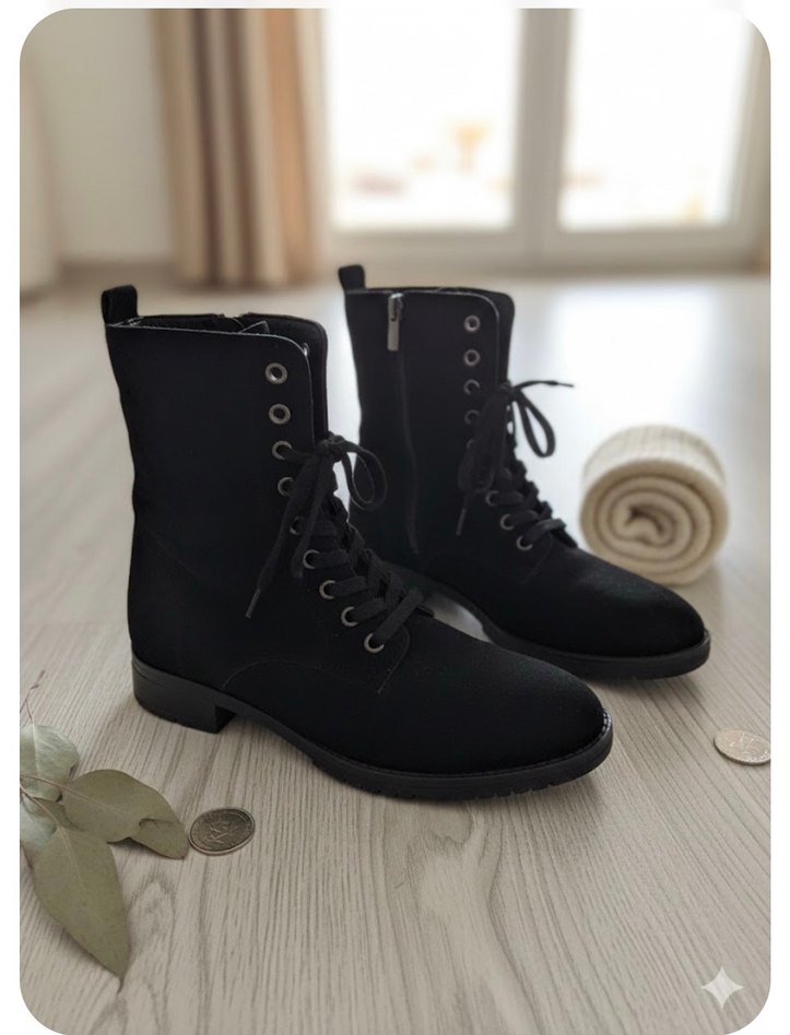 Siyah süet kadın botlar, blok topuklu ve kemer detaylıdır. Desensiz, rahat goth tarzında, günlük kullanıma uygundur. Bir kaç kez giyilmiştir bir sorunu yoktur.