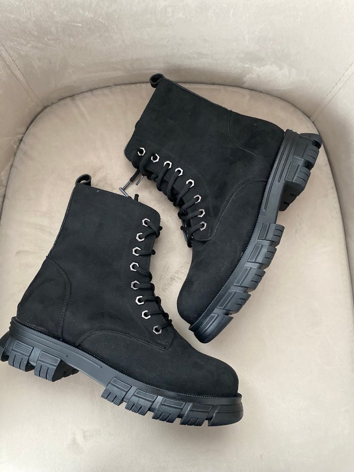 Siyah süet kadın bot, kürk detaylı ve kalın topuklu. Desensiz, günlük kullanıma uygun, trend sokak tarzı goth stilini yansıtır.