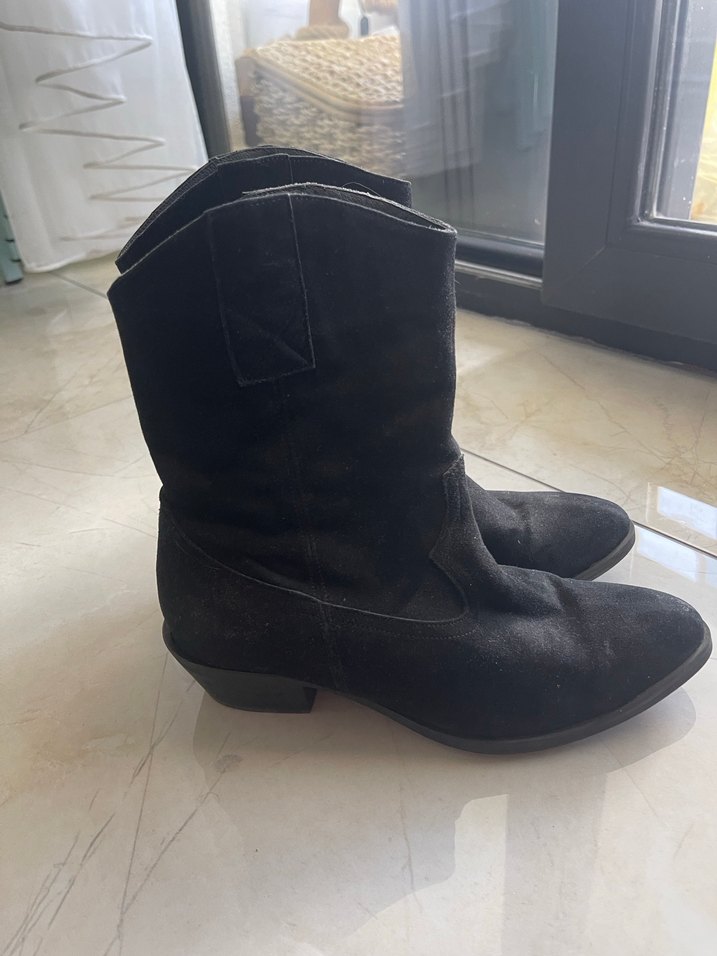 Siyah süet kadın bot, tokalı ve kalın topuklu. Minimalist gotik tarzda, günlük kullanıma uygun. Tamamen el yapımı deri ve süet içerikli. Hem şık hem sıcak tutuyor.