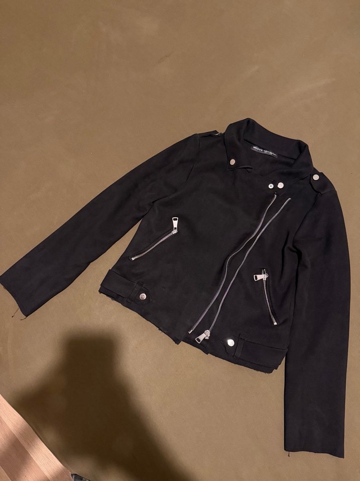 Fitted kesim siyah süet biker ceket, uzun kollu ve çıtçıtlı yakaya sahip, fermuarlı detaylarla trendy gündelik tarz için ideal.