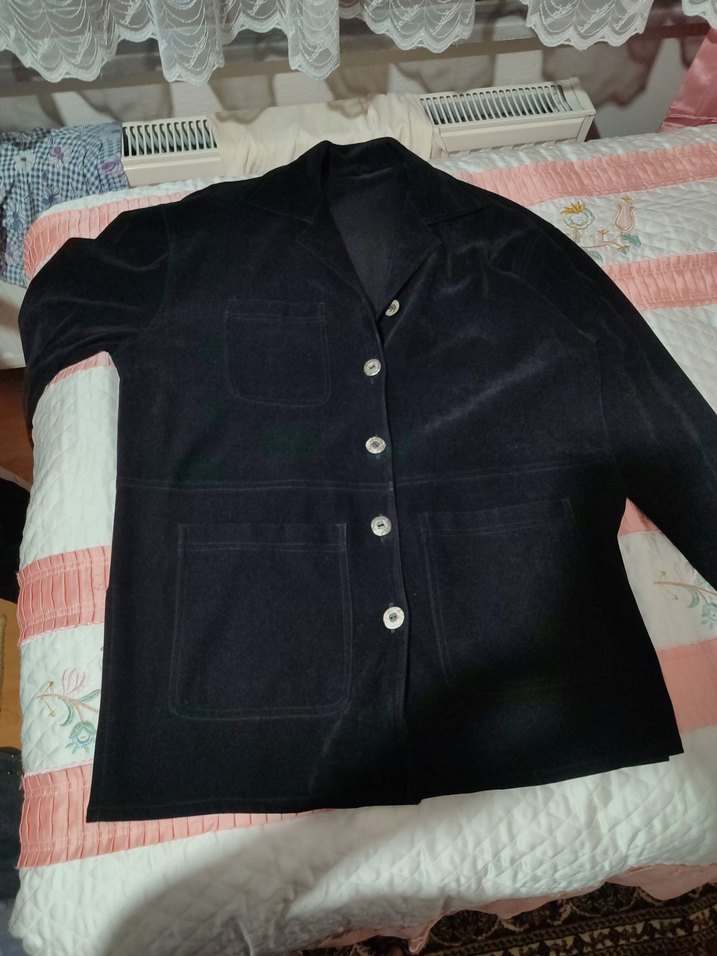 Siyah süet kumaştan yapılmış, düğmeli, uzun kollu ve normal uzunlukta kadın ceketi. Notch yaka ve rahat kesimiyle günlük sokak tarzına uygundur.