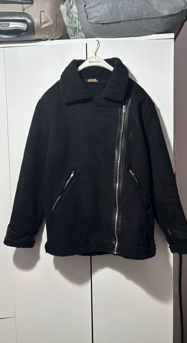 Siyah süet kadın ceket, notlu yakaya ve asimetrik fermuar kapamaya sahiptir. Bol kesim, uzun kollu ve rahat günlük kullanım için uygundur.