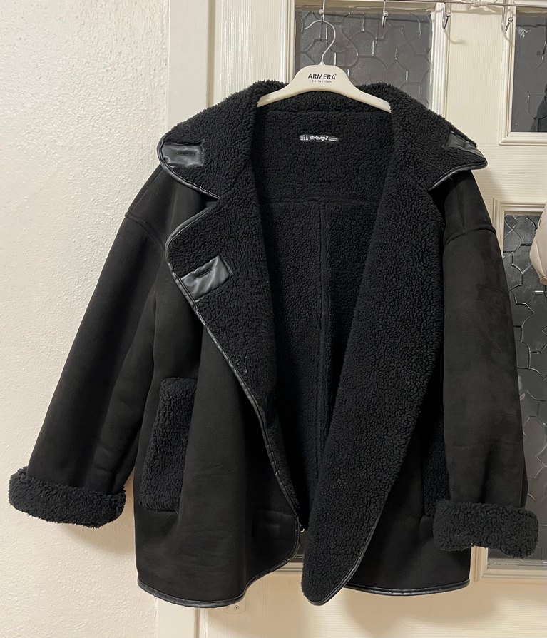 Siyah süet ceket, kürk detaylı ve kesik yakalıdır. Salaş kesimi ve askılı kollarıyla trend günlük stil için uygundur. Midi boyda, rahat kullanım sağlar.