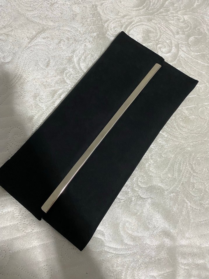 Siyah süet malzemeden yapılmış, zarif bir yarık detayı ve minimalist, çağdaş tasarımıyla ofis için uygun bir clutch çanta.