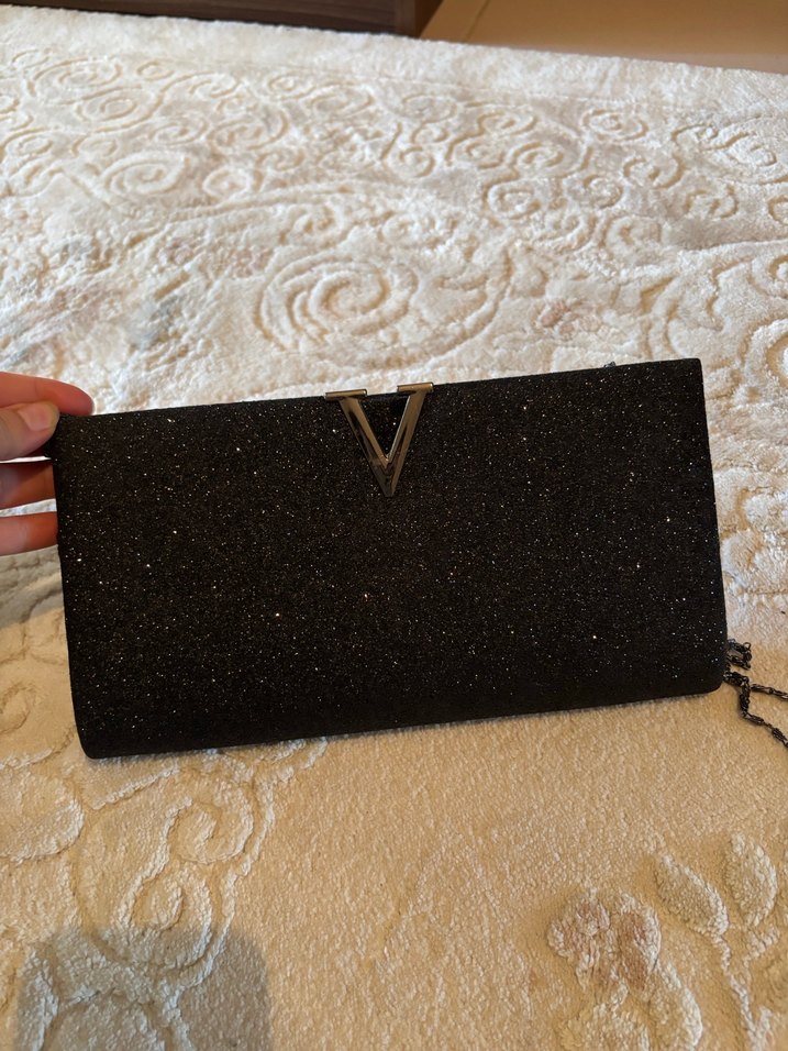 Siyah süet dokulu, baskılı clutch çanta, cırt cırtlı kapanış ve metal V detayıyla romantik gece için ideal, gotik ve şık tarzda.