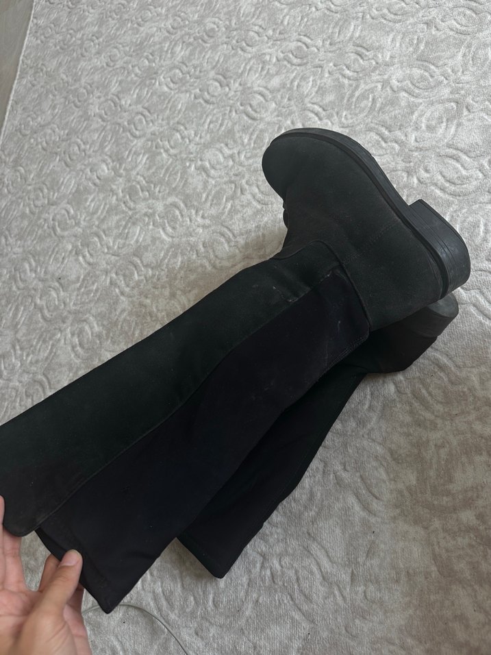 Siyah süet dizüstü botlar, blok topuklu ve arkadı çorap dalgıç kumaş şeklindedir. Rahat ve şık, günlük kullanıma uygundur.