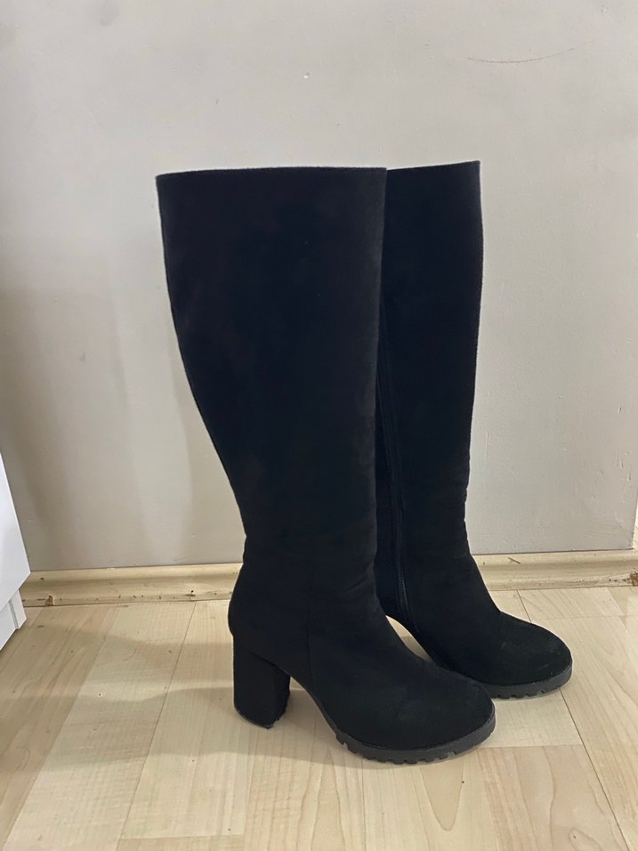 Siyah süet dizüstü botlar, blok topuklu, rahat ve gotik tarzda günlük kullanıma uygun. Zahmetsiz şıklık sunar.