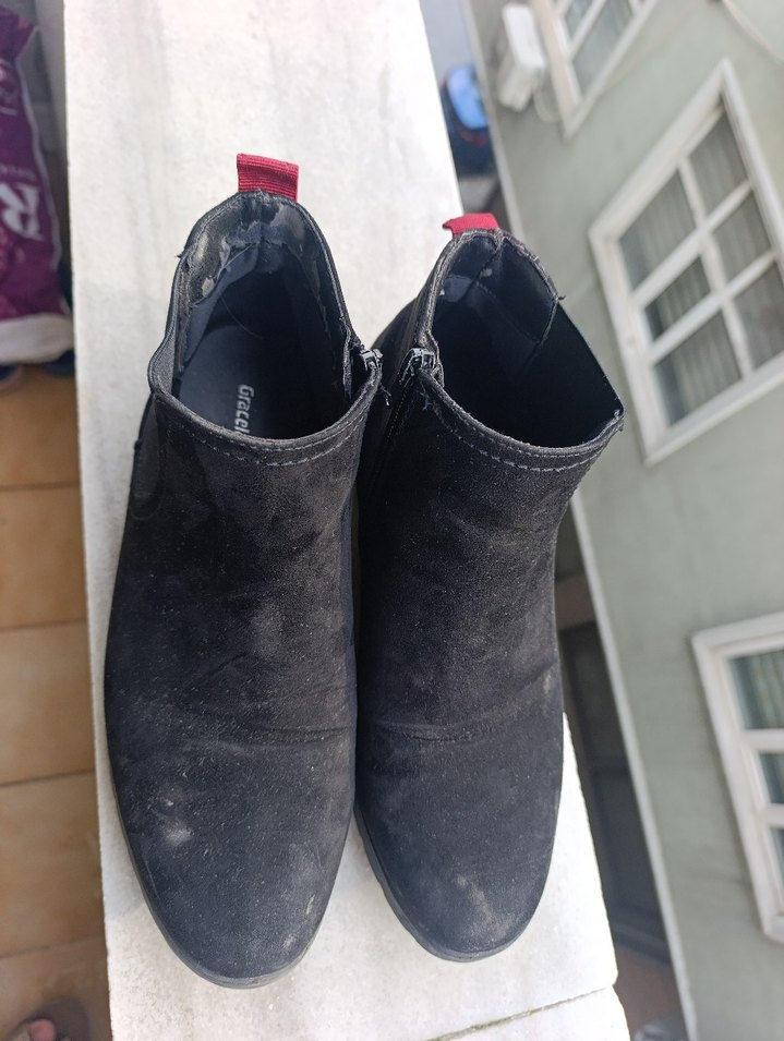 Siyah süet kadın botlar, dolgu topuklu ve tokalıdır. Gotik tarzda, desen içermeyen günlük kullanıma uygundur.