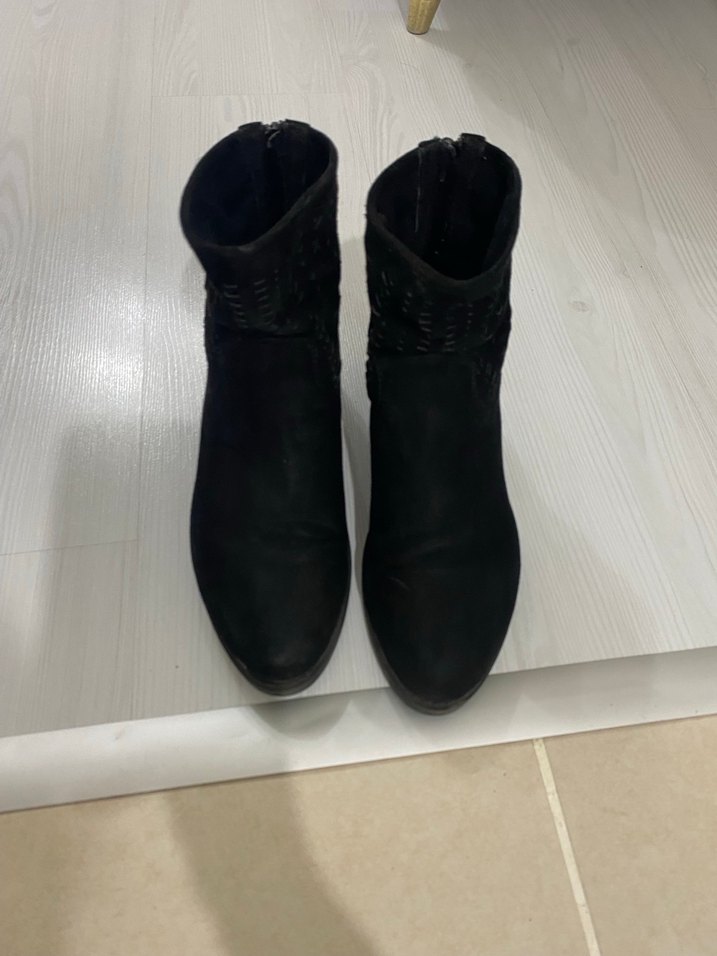 Siyah süet kadın botlar, dolgu topuklu ve tokalı detaylıdır. Minimalist gotik tarzıyla günlük kullanıma uygundur.