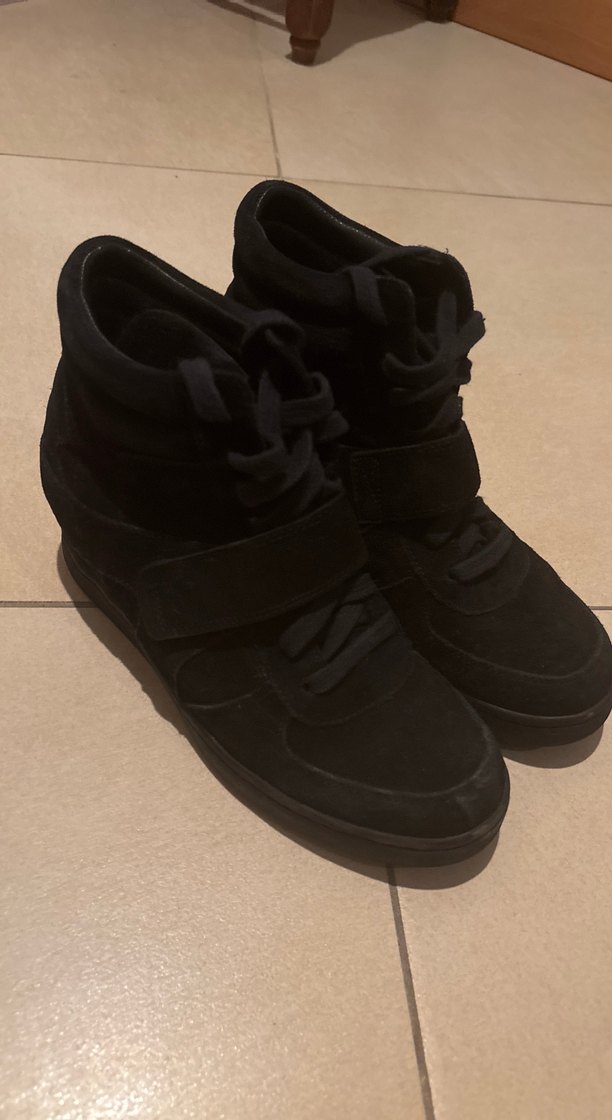 Siyah süet malzemeden, dolgu topuklu ve cırt cırtlı kadın spor botu. Günlük sokak stili için uygun, desen içermeyen rahat tasarım.