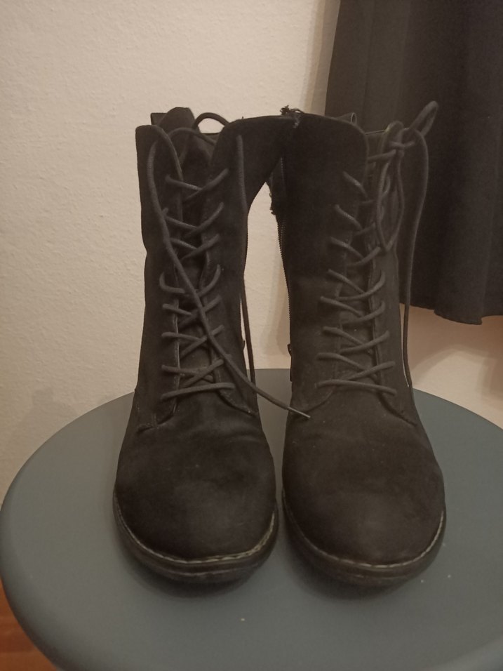 Siyah süet kadın botları, dolgu topuklu ve tokalı detaylı, günlük kullanım için uygun goth tarzında. diğer marka
