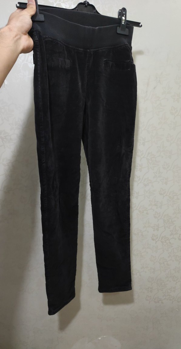 Siyah süet kumaştan, midi boy ve dar kesim kadın pantolon. Sol ön cebinde hafif yırtık ve renk solması mevcut, içi yünlü kışın sıcak tutar. XL beden ancak M uyumlu.