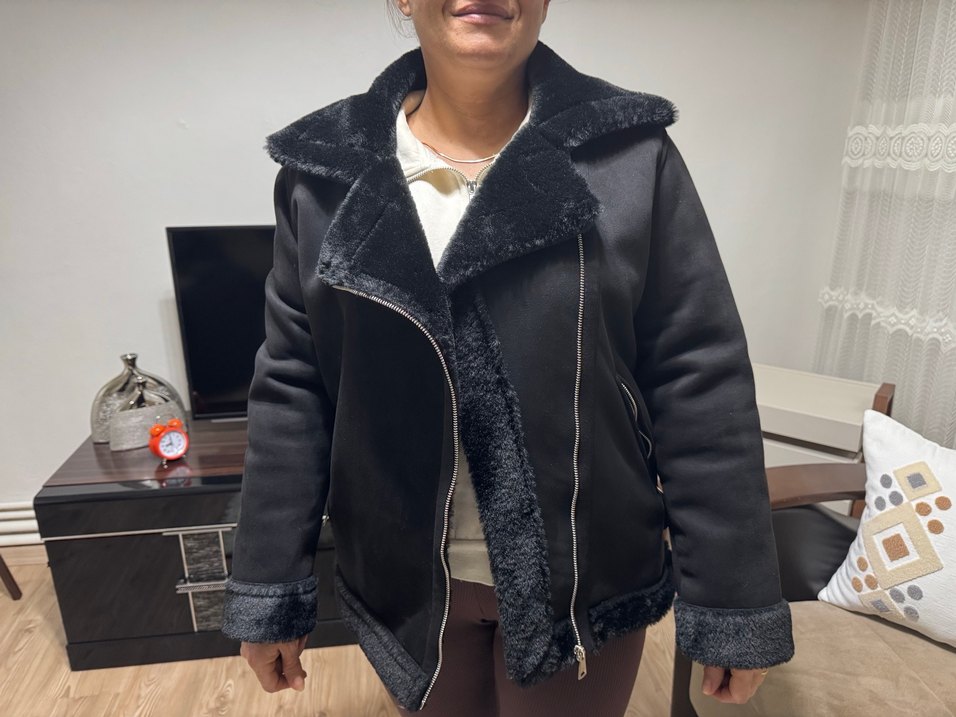Siyah süet kadın kışlık ceket, kürk detaylı, kesik yaka ve uzun kolludur. Rahat kesimi ve midi boyuyla günlük kullanıma uygundur. ️