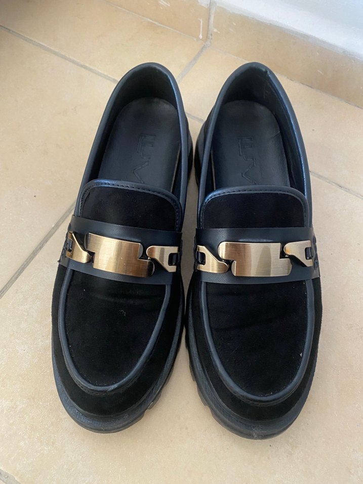 Siyah süet kadın loaferlar, gold tokalı ve blok topuklu. Sokak stiline uygun, günlük kullanıma ideal, şık ve yenilikçi tasarım.