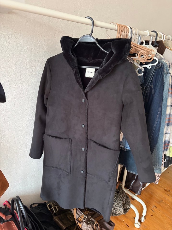 Siyah süet kumaştan yapılmış, kürk detaylı ve geniş kesimli midi uzunluğunda kadın kabanı. Günlük sokak stiline uygun, uzun kollu ve yakalıdır. ❄️