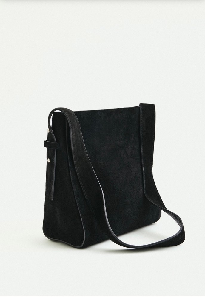 Siyah gerçek süet kadın omuz çantası, minimalist ve çağdaş tarzda, zahmetsiz şıklık sunar. Desensiz ve günlük kullanıma uygundur.