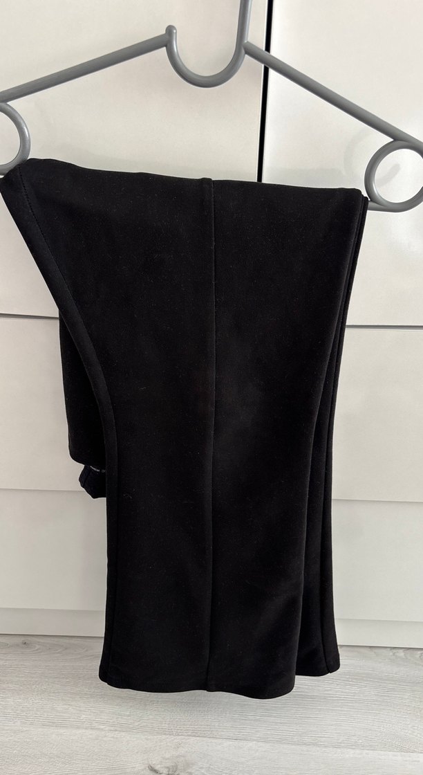 Fitted kesim siyah süet kadın pantolon, midi boy ve fermuarlı detaylarla minimalist goth tarzını yansıtıyor. Günlük kullanım için uygundur. İspanyol paça