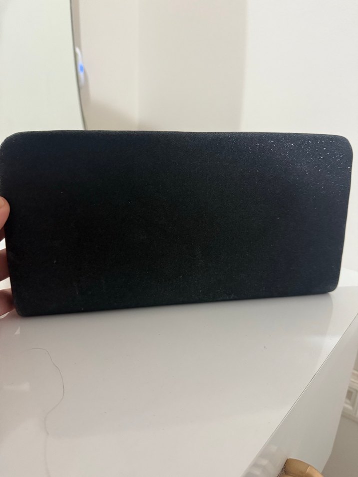 Siyah süet malzemeden yapılmış, desen içermeyen minimalist tasarıma sahip, cırt cırtlı kapamalı kadın portföy çanta.