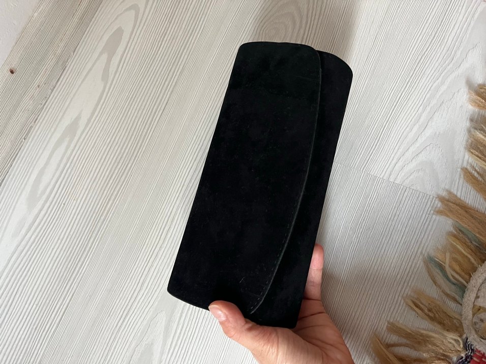 Siyah süet malzemeden yapılmış, minimalist goth tarzında, cırt cırtlı kapaklı kadın portföy çanta. Günlük kullanım için uygun, desensiz ve sade tasarım.