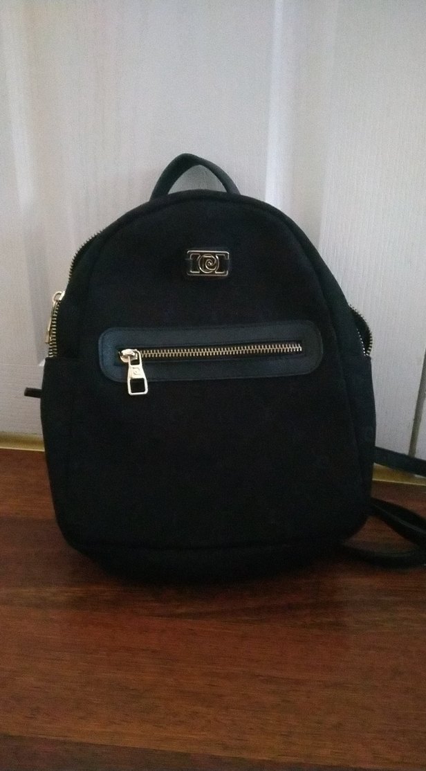 Siyah süet kumaştan yapılmış, baskılı ve fermuarlı ön cepli, minimalist gotik tarzda kadın sırt çantası.