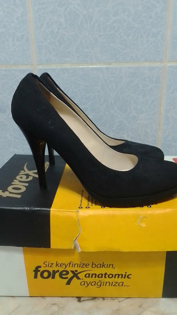 Siyah süet kauçuk malzemeden yapılmış yüksek topuklu stiletto ayakkabı. Cesur iş tarzı ve gotik stil için ideal, ofis kullanımı için uygun. Forex anatomic konforlu tasarım içerir. 1 kere giyildi