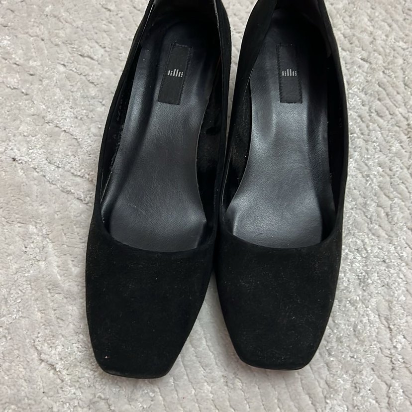 Siyah süet, blok topuklu kadın babetler. Minimalist ve desensiz tasarımıyla ofis kullanımına uygundur.