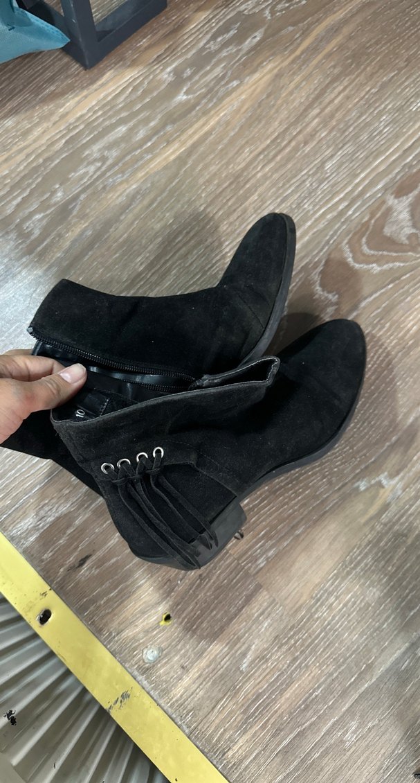 Siyah süet malzemeden yapılmış, tokalı ve blok topuklu kadın botları. Desensiz tasarımıyla rahat, gündelik ve gotik tarzlara uyum sağlar.