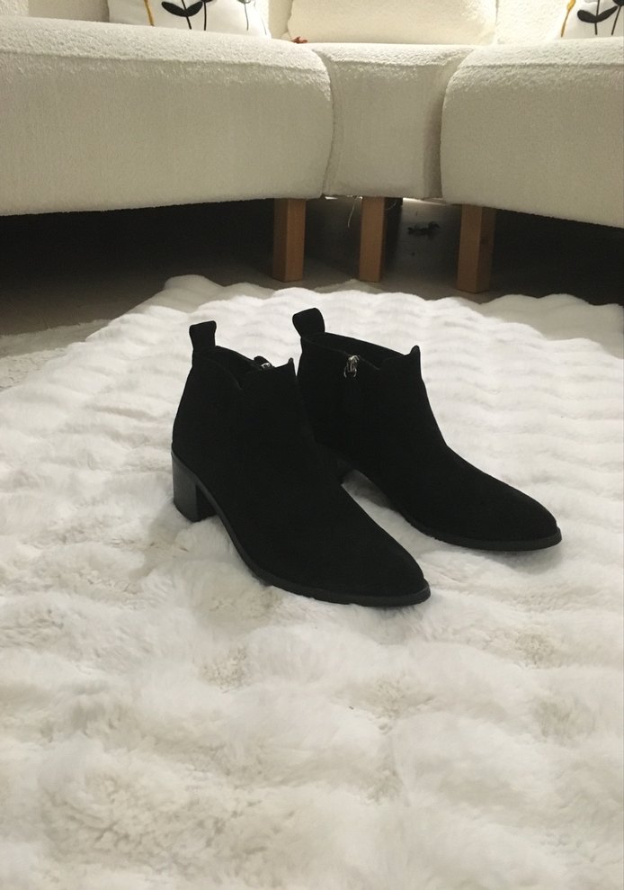 Blok topuklu siyah süet kadın botları, minimalist gotik stil sunar. Trendy günlük kullanıma uygun, zahmetsiz şıklık sağlar.