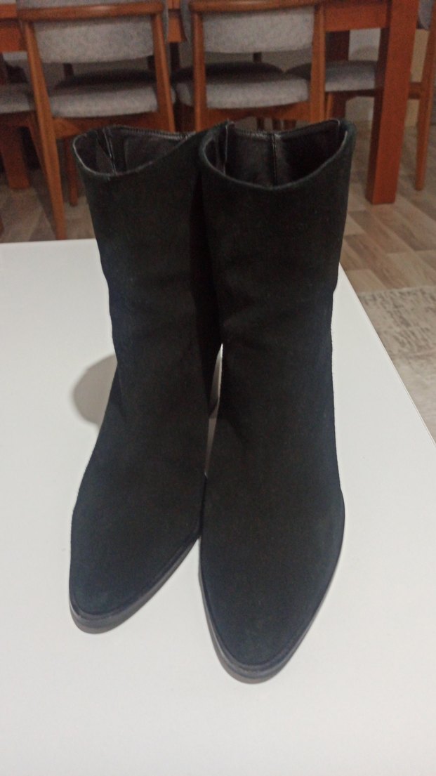 Siyah süet kadın botları, blok topuklu, minimalist ve gotik tarzda. Günlük kullanım için zahmetsiz şıklık sunar.
