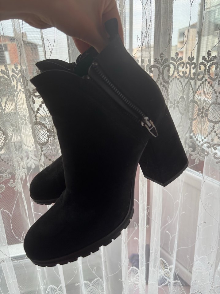 Max 3 kez giyilmiştir. Ayagımda hicbir problem yok bazı izler mevcut anca ayakkabıya egilip bakılsa anca anlaşilir oda ayakkabılıkta durmaktan oldu içinde hala yeni kokusu mevcut. Siyah süet kadın botları, blok topuklu ve Velcro kapamalı, rahatgotik tarzda. Topuk boyu 8,5 cm