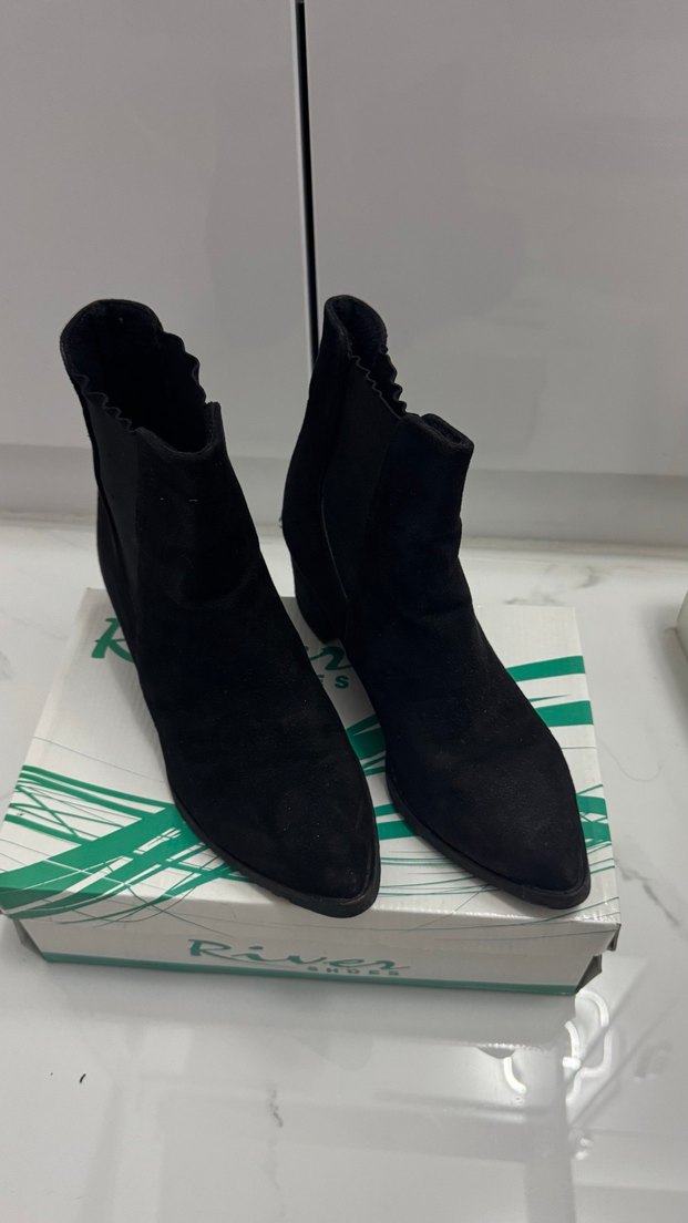 Siyah süet kadın bot, blok topuklu ve Velcro detaylı. Goth tarzında, günlük kullanım için uygundur. Bilek boy