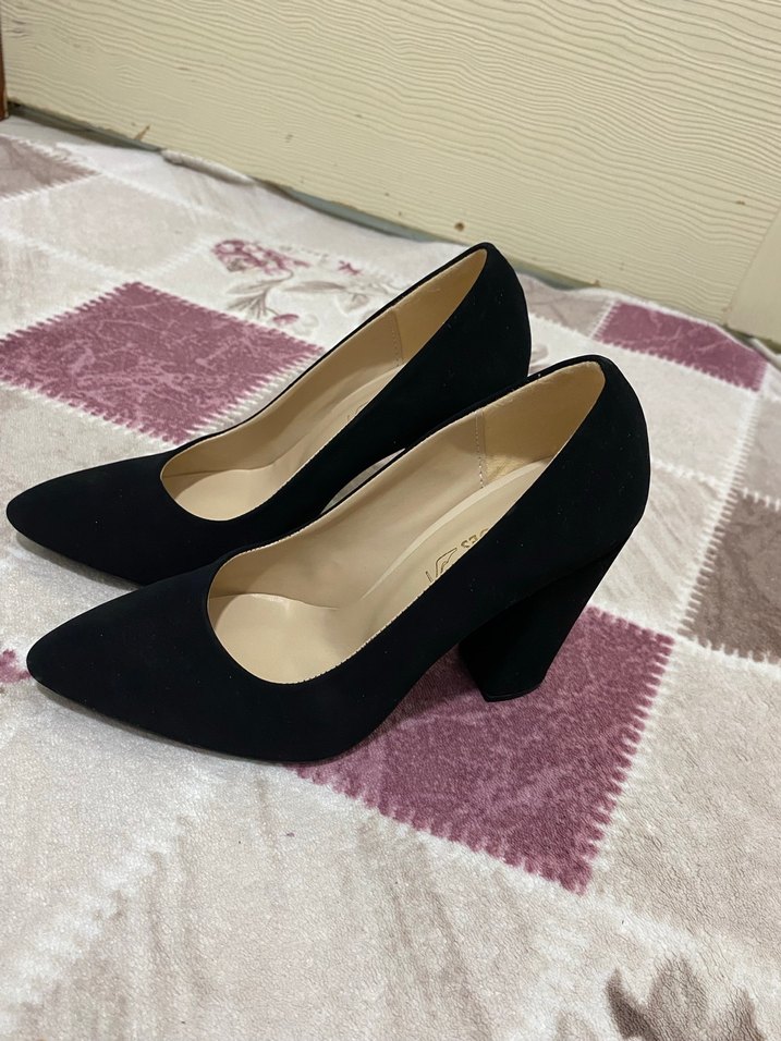 Siyah süet kadın stilettolar, blok topuklu ve modern klasik tarzda, hafif yılan deseni ile ofis için zarif ve şık.Hiç kullanılmadı.